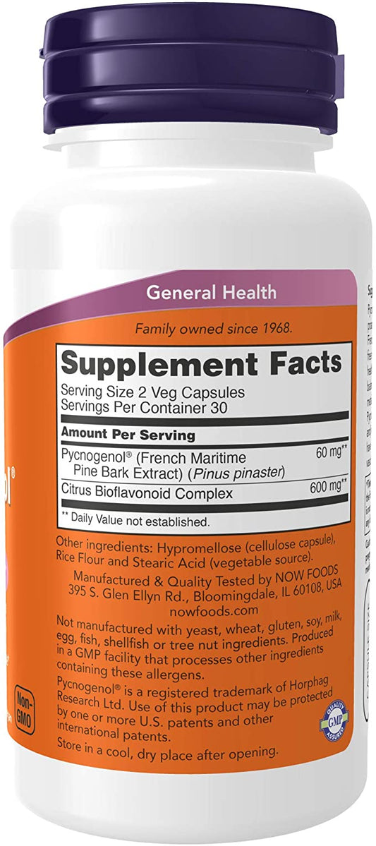 NOW Supplements, Pycnogenol 30 mg (a Unique Combination of Proanthocyanidins from French Maritime Pine) with 300 mg Bioflavonoids, 60 Veg Capsules