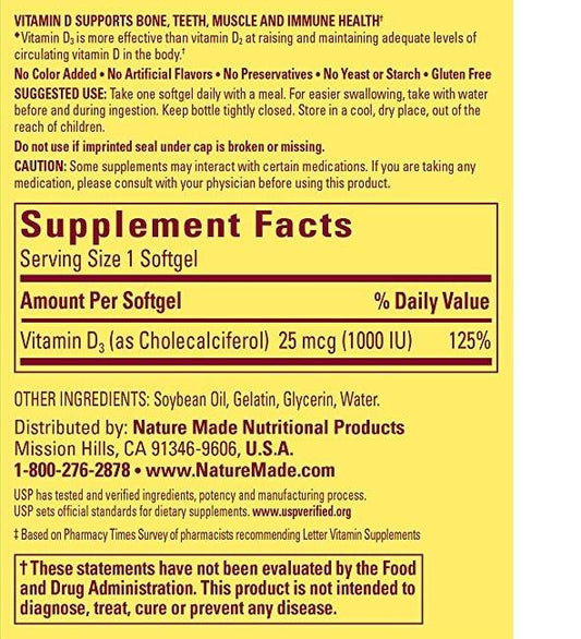 Nature Made Vitamin D3 1000 IU - 100 softgels (Packaging May Vary)