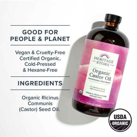 Heritage Store Organic Castor Oil Nourishing Treatment 100% Cold-Pressed for Hair, Skin, Lashes & Brows, 16 fl.oz / 473ml