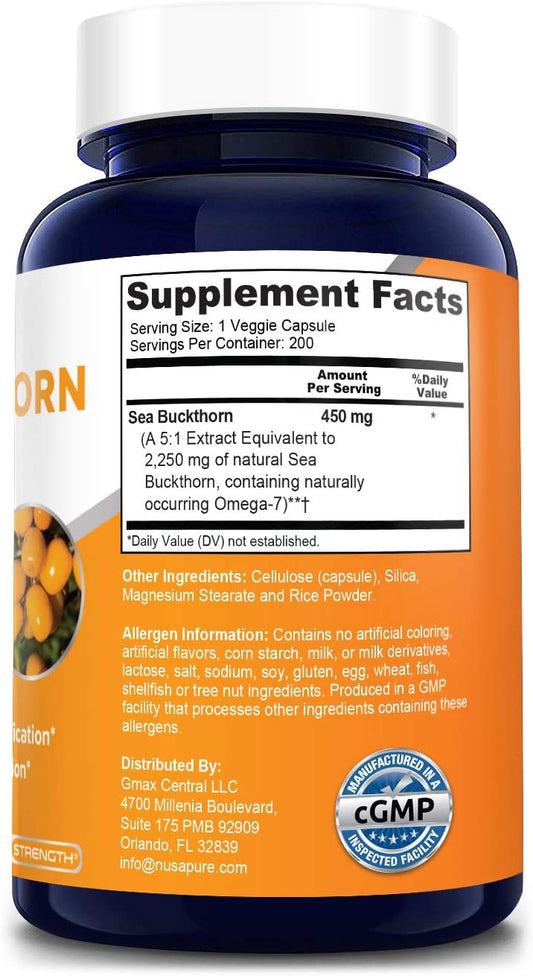 NusaPure Sea Buckthorn Omega-7, Healthy Digestion, Antioxidant,Dietary Supplement 2250mg 200vegacaps
