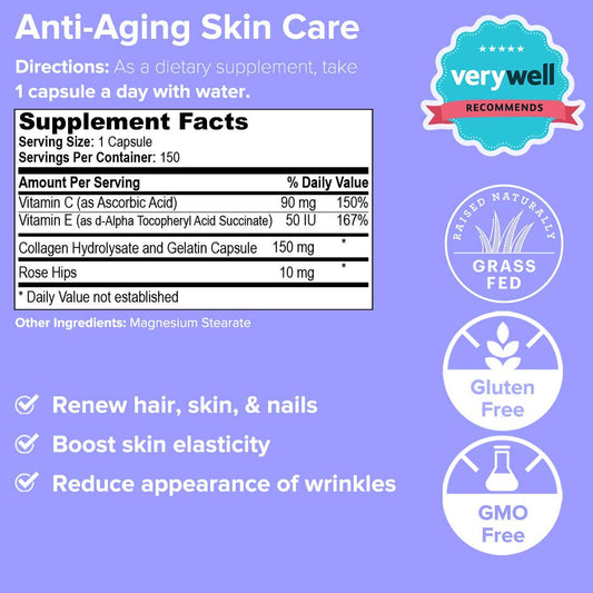 Sanar Naturals Premium Collagen Pills with Vitamin C & E, 150 Capsules, Supports Hair Growth, Skin, Nails, & Joints, Anti Aging