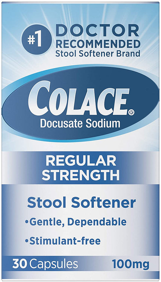 Colace Docusate Sodium Regular Strength Stool Softener 100 mg, 30 Capsules