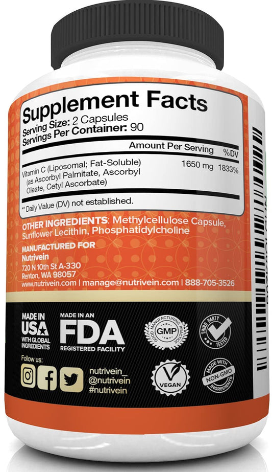 Nutrivein Liposomal Vitamin C 1650mg, 180 Vegetable Capsules
