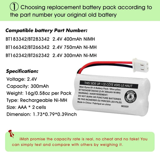 iMah 2.4V 300mAh Ni-MH Cordless Phone Battery (BT162342/BT262342) 2-Pack
