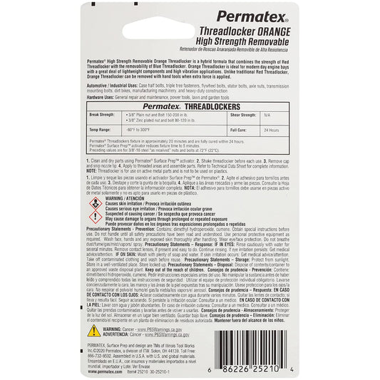 Permatex Threadlocker High Strength Removable Orange 25210 10ml