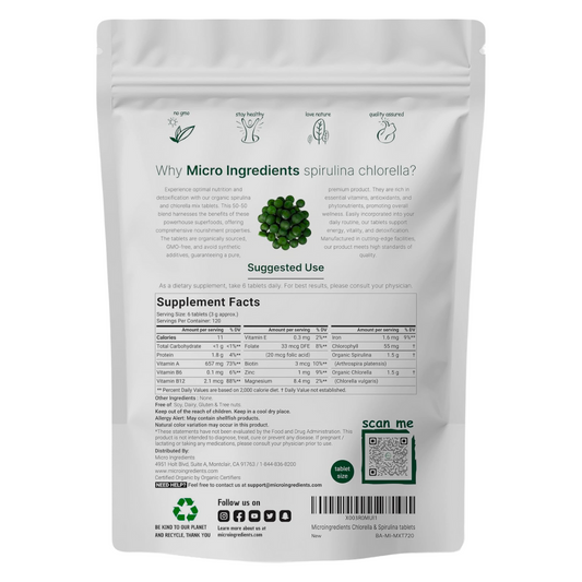 Microingredients Organic Spirulina Chlorella Supplement 720 Tablets