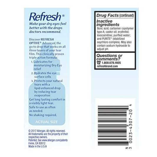 Refresh Optive Advanced Lubricant Eye Drops Triple Action Relief (Twin Pack) 10ml Each
