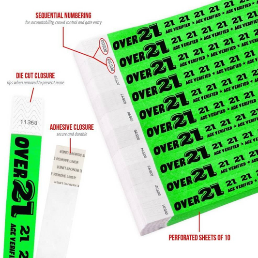 WristCo Over 21 Neon Green 3/4" Tyvek Paper Wristbands for Events, Pack of 200