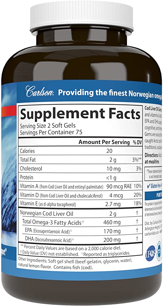 Carlson Wild Norwegian Cod Liver Oil Gems, 460 mg Omega-3s + Vitamins A & D3, Natural Lemon 150 Softgels