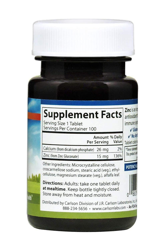 Carlson Zinc 15 mg 100 Tablets Immune Support, Antioxidant, Skin Health