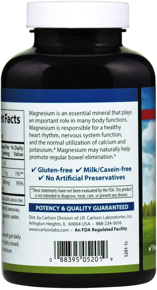 Carlson Magnesium Gels, 400 mg 100 Softgels Heart & Muscle Support