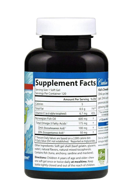 Carlson Kid's Chewable DHA Bursting Orange Flavor 100 mg 120 Softgels Brain, Vision, Growth Development