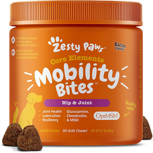 Zesty Paws Mobility Bites Glucosamine with Chondroitin & MSM Hip & Joint Health for Dogs, Bacon Flavor - 90 Soft Chews