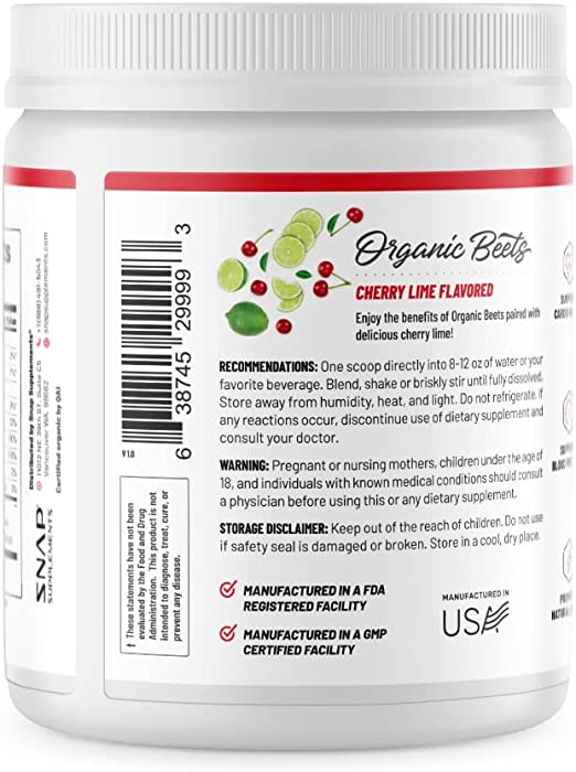SNAP Nitric Oxide Organic Beets Cherry Lime Flavor for Heart Muscle Function, Energy Stamina 250 g