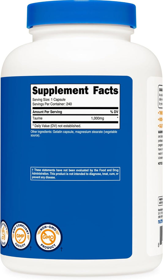 Nutricost Taurine 1,000mg Per serving Dietary Supplement, 240 Capsules
