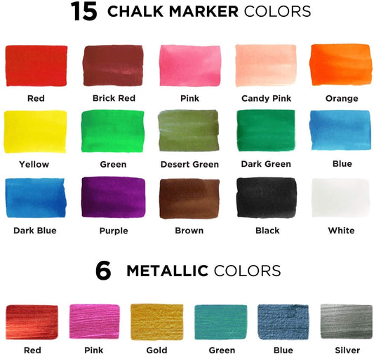 Chalkola Pack of 21, 15 Chalk Pens + 6 Metallic Markers (Colors May Vary)