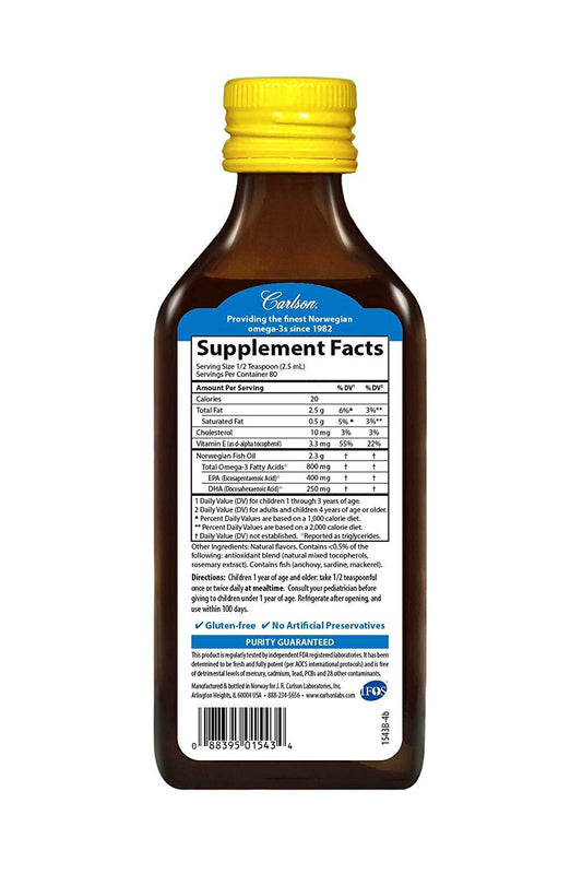 Carlson Kid's The Very Finest Fish Oil 800 mg Omega 3 Natural Lemon Flavor 6.7 fl. oz 200 mL