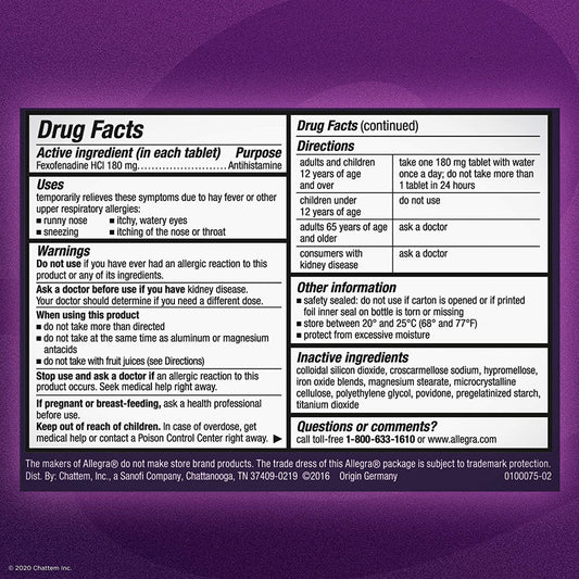 Allegra 24 Hour Indoor & Outdoor Allergy Relief 180mg Non-Drowsy, 30 Tablets