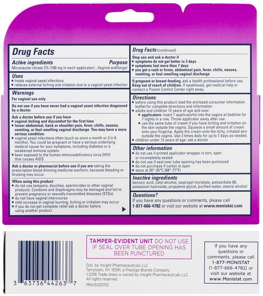 Monistat 7 Day Treatment Cream Vaginal Antifungal 1 tube 45g (7 Disposable Applicators)
