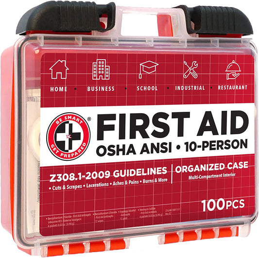 Be Smart Get Prepared 100Piece First Aid Kit, Exceeds OSHA Ansi Standards for 10 People - Office, Home, Car, School, Emergency, Survival, Camping, Hunting, & Sports