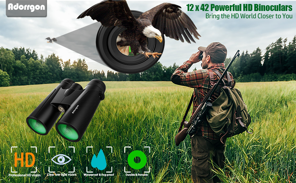 12x42 Powerful Binoculars with Clear Weak Light Vision - Lightweight (1.1 lbs.) Binoculars for Birds Watching Hunting Sports - Large Eyepiece Binoculars for Adults with BAK4 FMC Lens