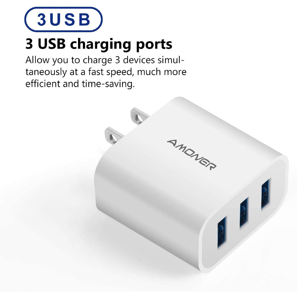 2-Pack - Amoner Wall Charger Upgraded 15W 3-Port USB Plug Cube Portable for Smart Devices