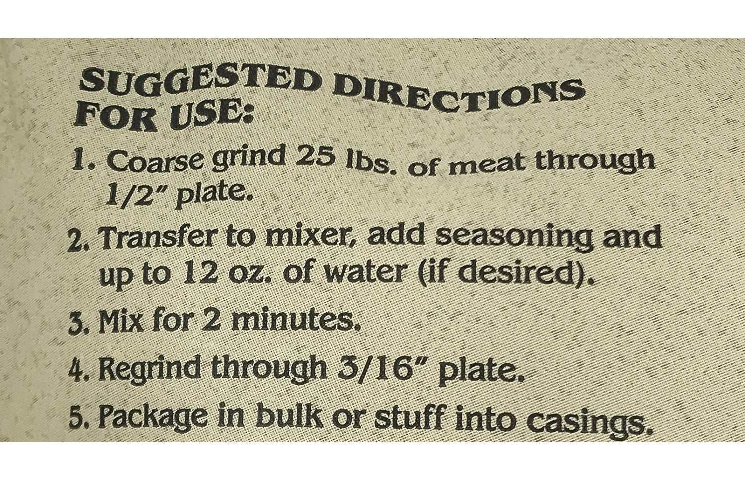 Mixing bag with 25 pounds. meat. You can use 25 pounds. lean pork (boneless pork buttocks will work if you can't buy 80/20 pork ornaments from a butcher's shop). Or you can use 22 pounds. lean pork and 3 pounds. lean beef. Empty the whole bag of seasonings in the 25 pounds. meat and mixture thoroughly (works best if you cut the meat into small pieces first). Then fill the sausage in the natural pork guts for links. Or you can pack the sausage in 1 lb. Bulk freezer bags.