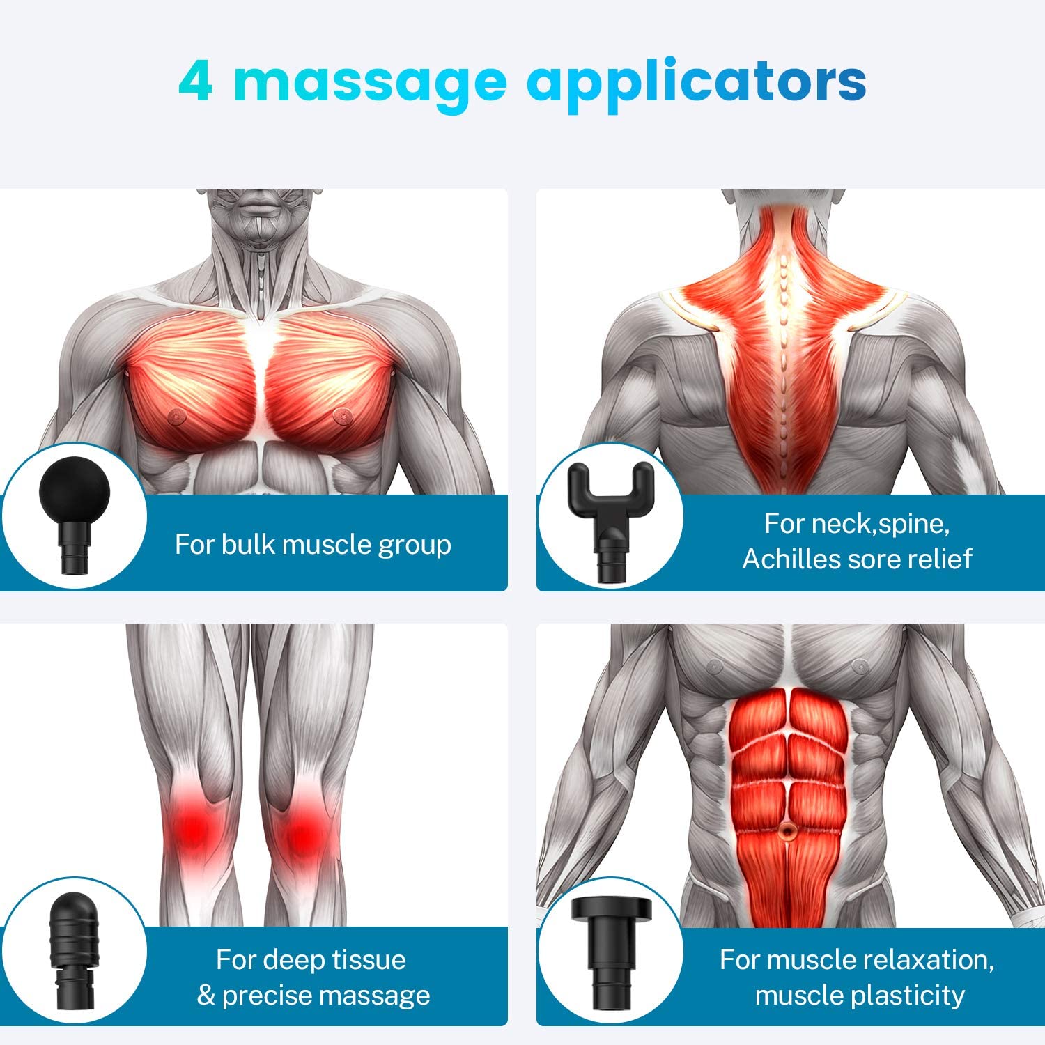 Aigrous A9 Pro percussion massager is a handheld device that applies pulses of concentrated pressure deep into your muscle tissue. This form of deep-tissue massage can work knots and tension out of the muscles while improving blood flow and quickly enhancing range of motion. When used properly, a percussion massager can shorten your recovery time while relieving some of the pain, tension and soreness that comes naturally from intense martial arts workouts. Aigrous A9 Pro with 4 applicators works for full-body muscle massage. Ball Shape for bulk muscle groups, like waist, back, buttocks, thighs, calves; Point Shape for deep tissue massage, precise massage; Flat Shape for muscle relaxation, muscle plasticity; Folk Shape for massaging the neck, spine, and Achilles.