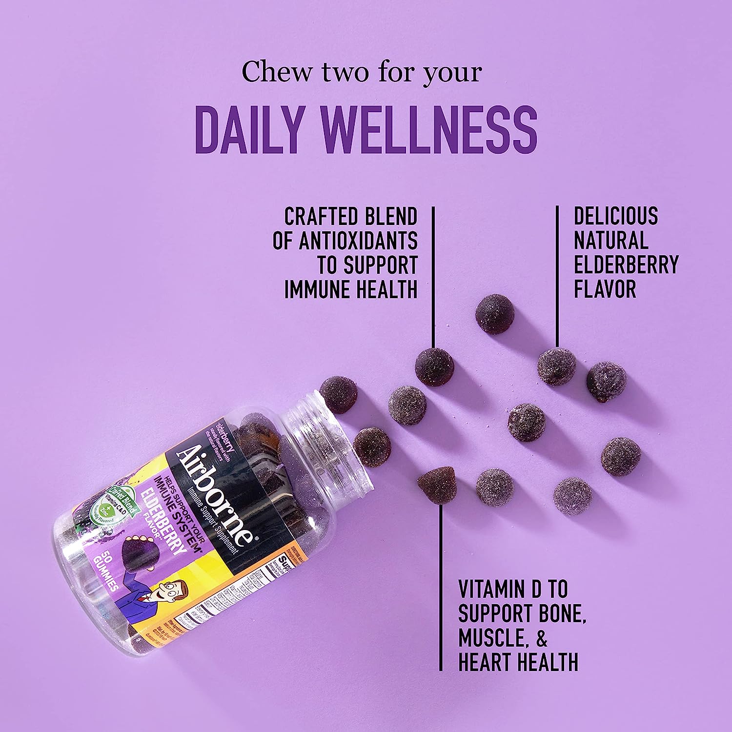 Say hello to delicious, year-round immune support* for the whole family! Made from a carefully crafted blend of vitamins, minerals, and herbs - everyone (including kids) will love these delicious, easy-to-take gummies. Airborne Elderberry flavored gummies contain Vitamin D (to support bone, muscle, and heart health) the powerful antioxidants Vitamin C (to support immune health. One serving also contains 18% of your Daily Value of Zinc, which is essential for the functioning and signaling of immune cells and plays a central role in your immune system.* Pretty impressive, huh? We like to think so!
