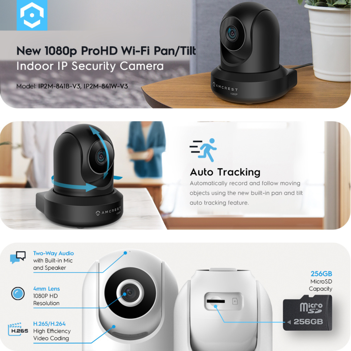 The new Amcrest 1080p ProHD soaks in the entire scene, dynamically painting all of the vivid colors and rich imagery, onto your desktop or smartphone in Full HD 1920x1080p resolution at 30fps. Cutting edge H. 265 high efficienct video coding technology allows for smoother video and reduces file sizes and bandwidth consumption. Receive intelligent alerts that send notifications directly to your computer or smartphone via the Amcrest View Pro app anytime motion or audio is detected. Create distinct motion detection zones and customize each zone's sensitivity to receive only the alerts that you need. Be notified anytime your smart home camera goes offline. The Amcrest ProHD 1080p camera features flexible storage options to a 256MicroSD, Amcrest Cloud, Amcrest Surveillance Pro for PC and Mac, Amcrest NVRs, Synology & QNAP NAS, FTP, Blue Iris and more, giving you the flexibility and security you need. This product may contain components which are not NDAA compliant. Easily communicate with loved ones anytime, anywhere, using the camera's built-in microphone and speaker. Cover every angle with 355° pan and 90°tilt. The night vision feature allows you to see up to 32 feet in the dark. Turn on Privacy mode to block both the video, audio and recording features to your camera, giving you peace of mind when you need it.