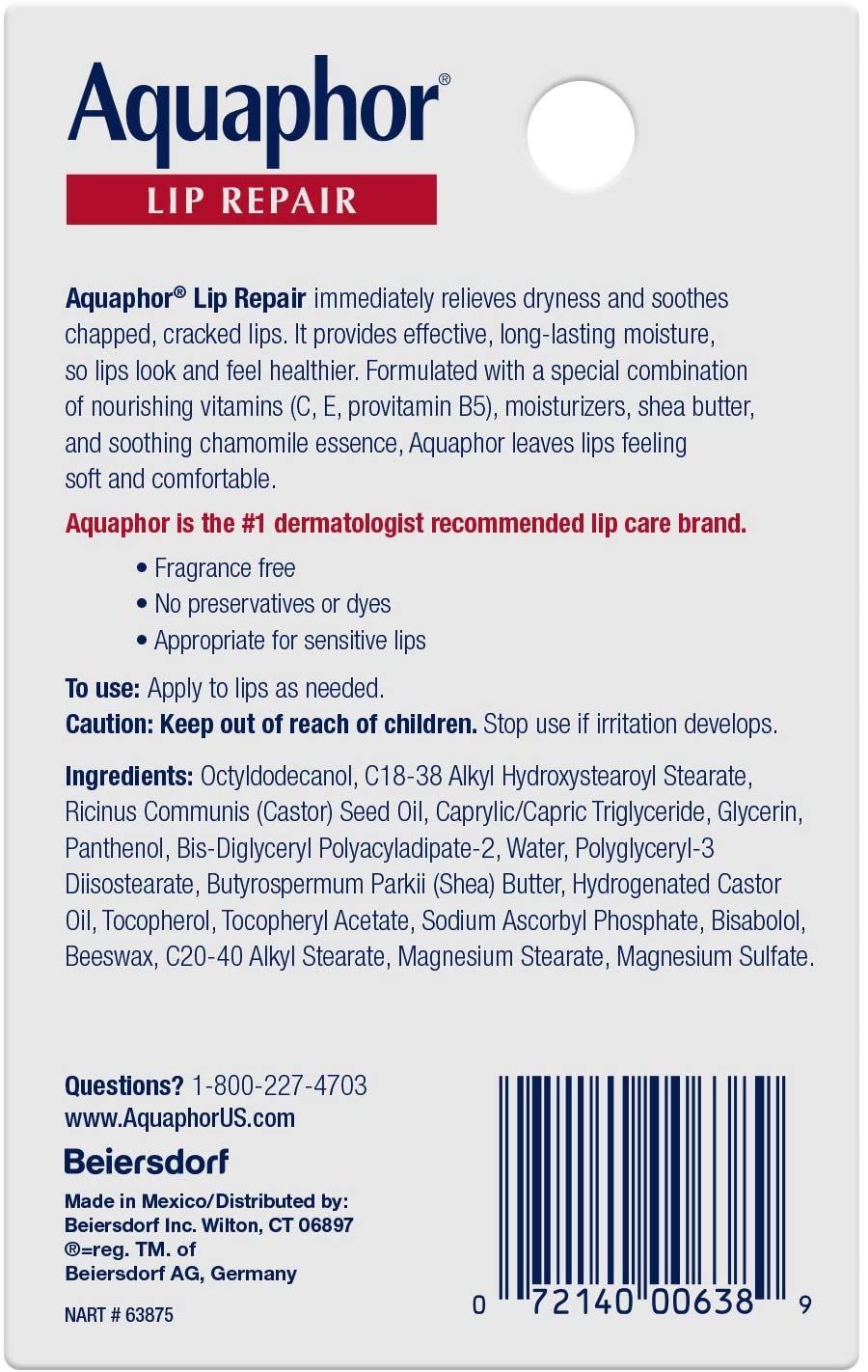Specially formulated for sensitive lips, Aquaphor Lip Repair is preservative and fragrance free. Aquaphor Lip Repair immediately relieves dryness and soothes chapped, cracked lips. It provides effective, long-lasting moisture, so lips look and feel healthier.