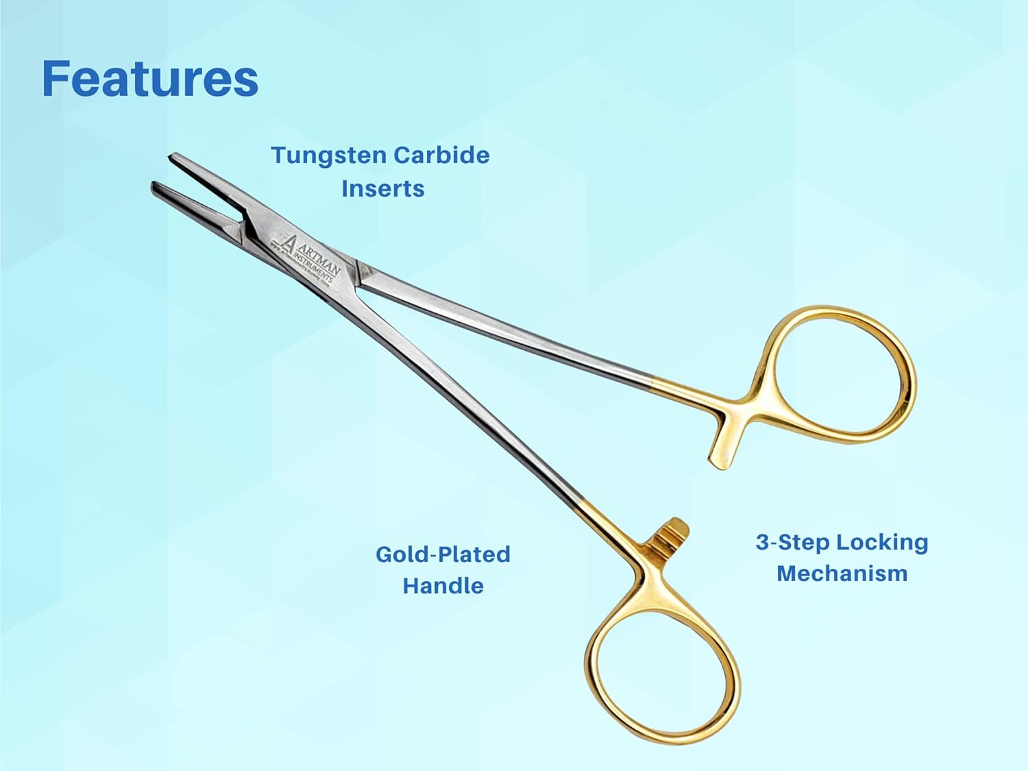 Made from high-quality stainless steel, the Mayo Hegar Needle Holder by ARTMAN Instruments features tungsten carbide inserts for enhanced grip, durability, and precision. Its ergonomic 6-inch design offers comfort and control, ideal for various procedures. The smooth, corrosion-resistant finish ensures long-lasting use and a professional look. A secure locking mechanism provides a firm hold during suturing. Rigorously tested for quality, this tool meets high medical standards.
