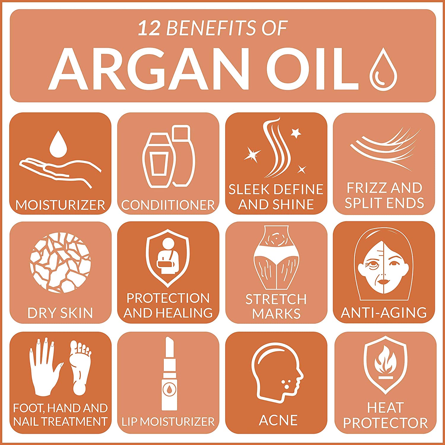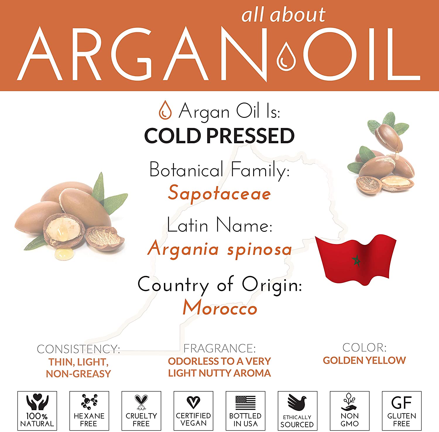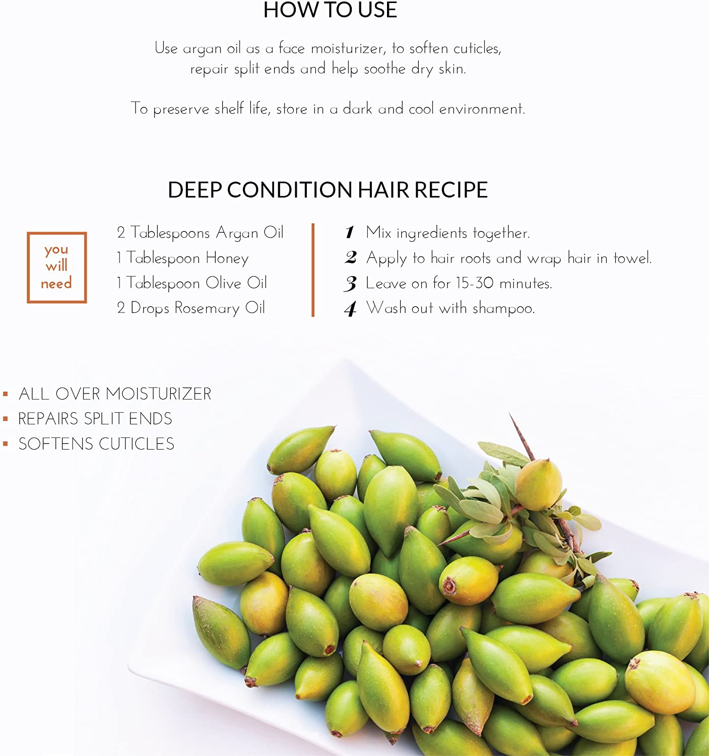 Argan oil is rich in natural phenols that are beneficial to hair follicles. Not only does it promote new hair growth, but also will help you grow healthy, thick looking hair. Many beauticians and dermatologists recommend Argan oil as a cosmetic treatment for the hair and skin.