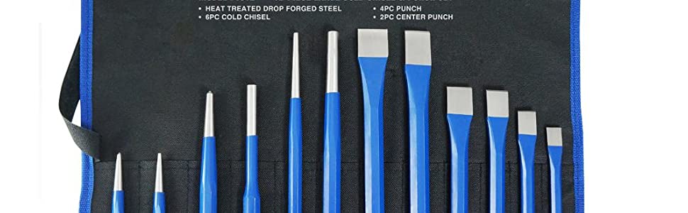 16pc set features hex shaped shanks for easy gripping with locking pliers and includes 5 tapered punches, 5 straight punches, 2 center punches, 3 cold chisels and chisel gauge.