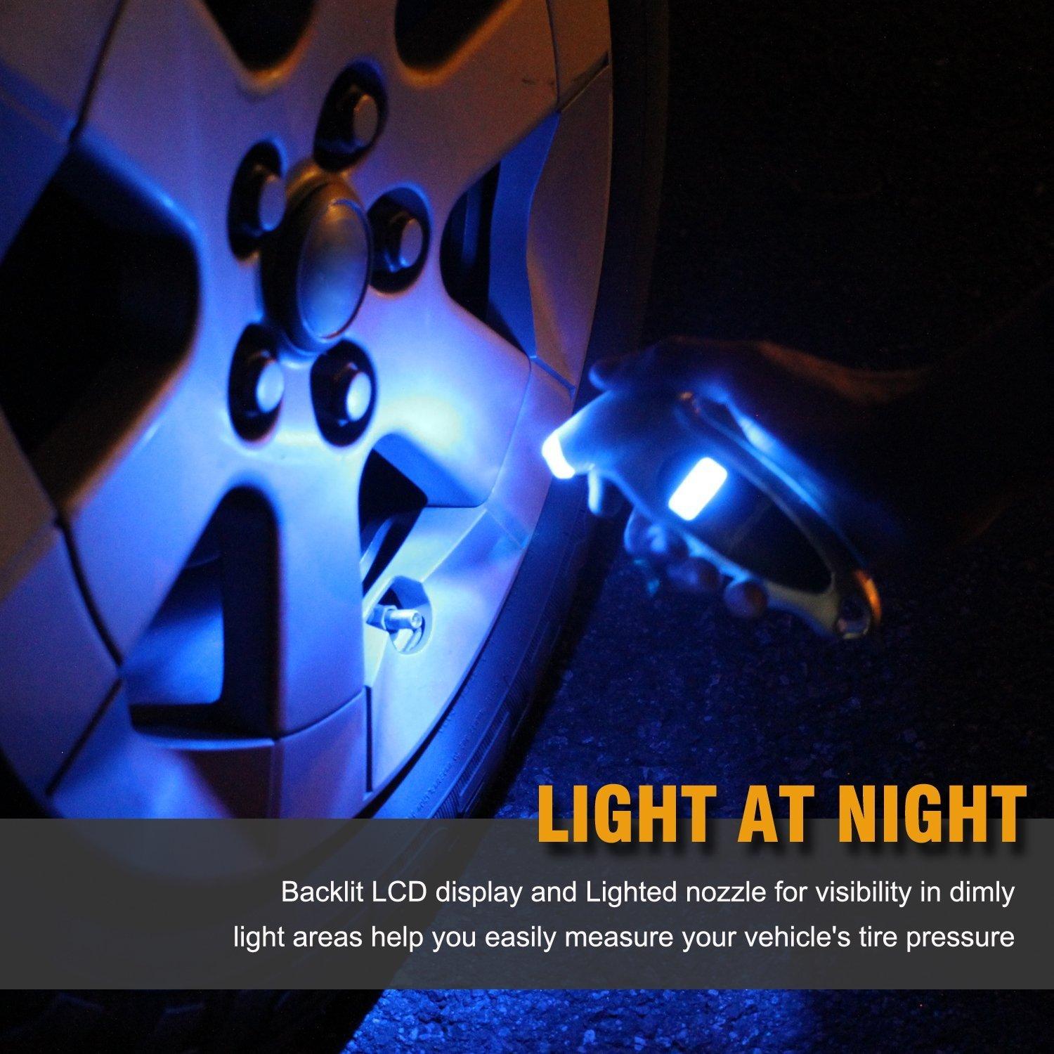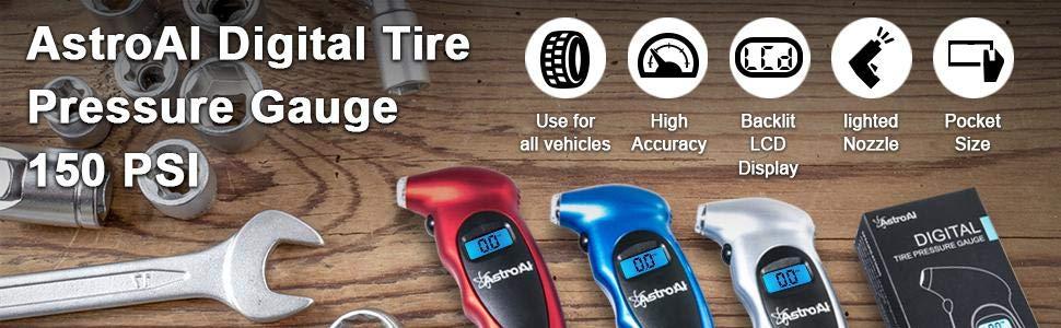 The AstroAI Digital Tire Pressure Gauge helps you maintain correct tire pressure, reduce tire wear and extend tire life. The Backlit LCD display and Lighted nozzle are for visibility in dimly light areas and the accurate and easy-to-read digits help you easily measure your vehicle's tire pressure.