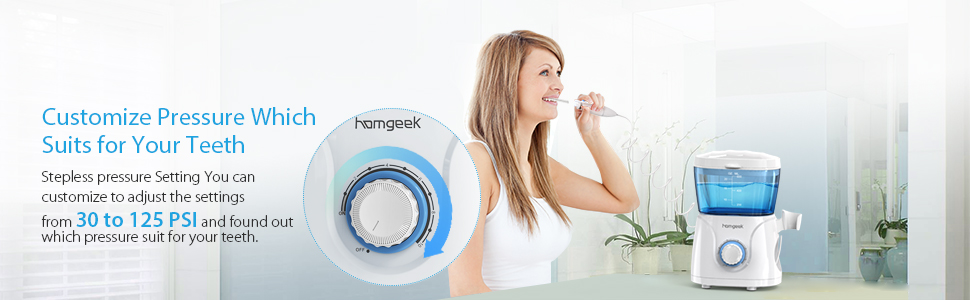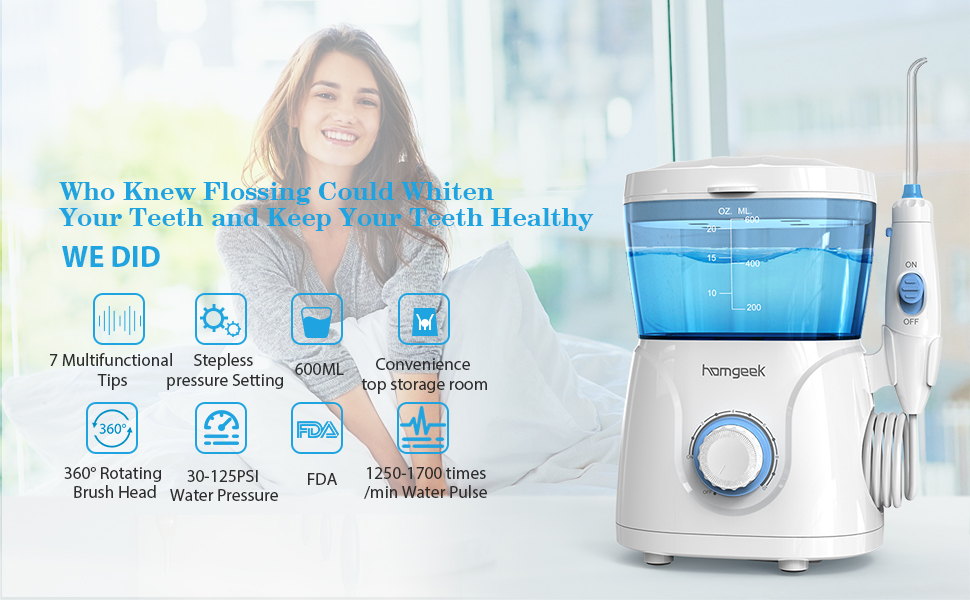- The Homgeek professional water flosser waterpick easy to use includes a Water On/Off switch on the handle with a new compact and contemporary design.Clinically proven remove up to 99.99% plaque.