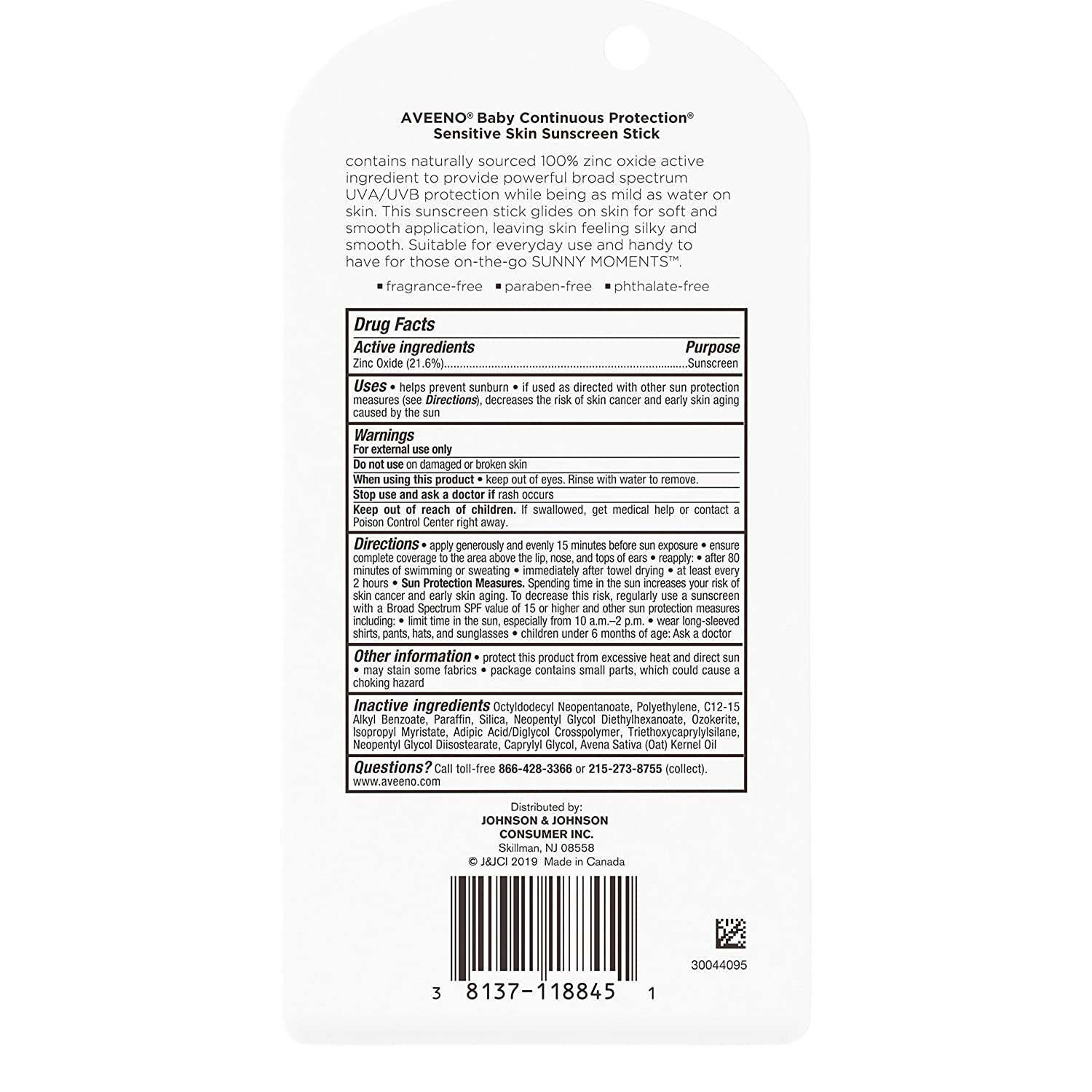 Aveeno Baby Continuous Protection Sensitive Skin Zinc Oxide Sunscreen Stick with Broad Spectrum SPF 50, 0.47 oz. / 13g