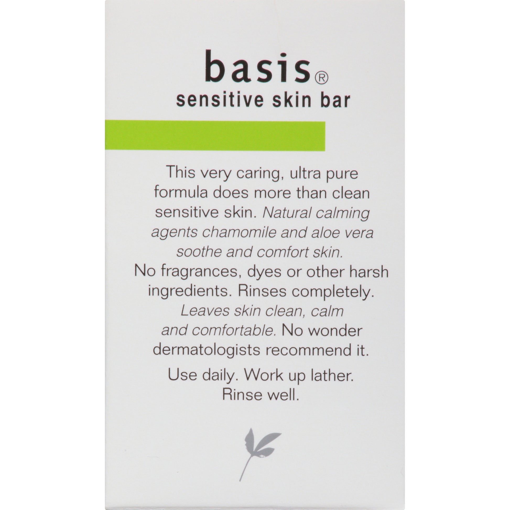 Basis Sensitive Skin Bar Soap the original, dermatologist-recommended basis soap for the purest, mildest clean ever. This very caring, the ultra-pure formula does more than clean sensitive skin. Natural calming agents, chamomile and aloe vera, soothe and comfort skin. Formulated with no fragrances, dyes or other harsh ingredients. Rinses completely and easily to leave skin clean, calm and comfortable. No wonder dermatologists recommend it. Use this bar soap as a body wash, hand soap or face wash. Keep this multipurpose soap in the shower and in a soap dish for convenient use. To use: Work up a lather in hand, washcloth or shower pouf. Massage over body, hands or face and rinse well. Safe for daily use.
