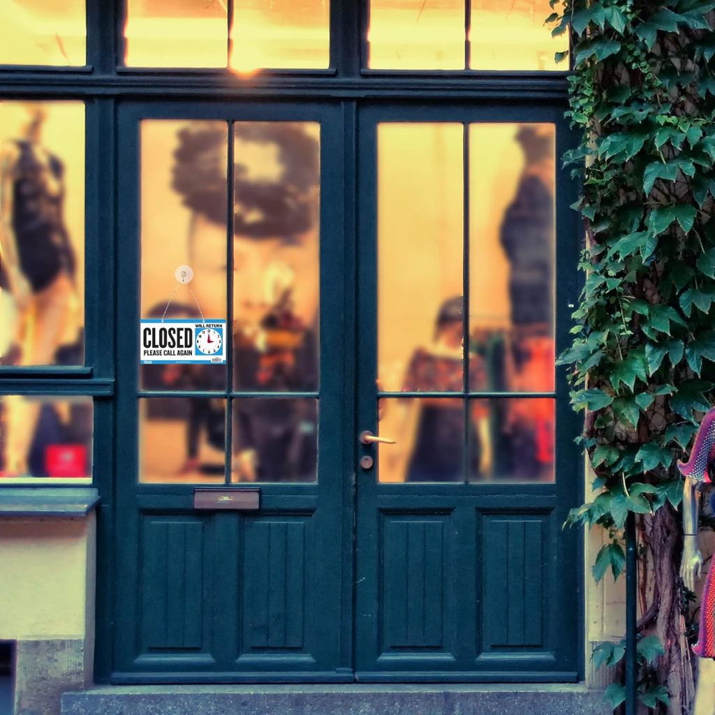 ● RETURN TIME. Double Sided design with a red clock hands showing your customers when you will return.