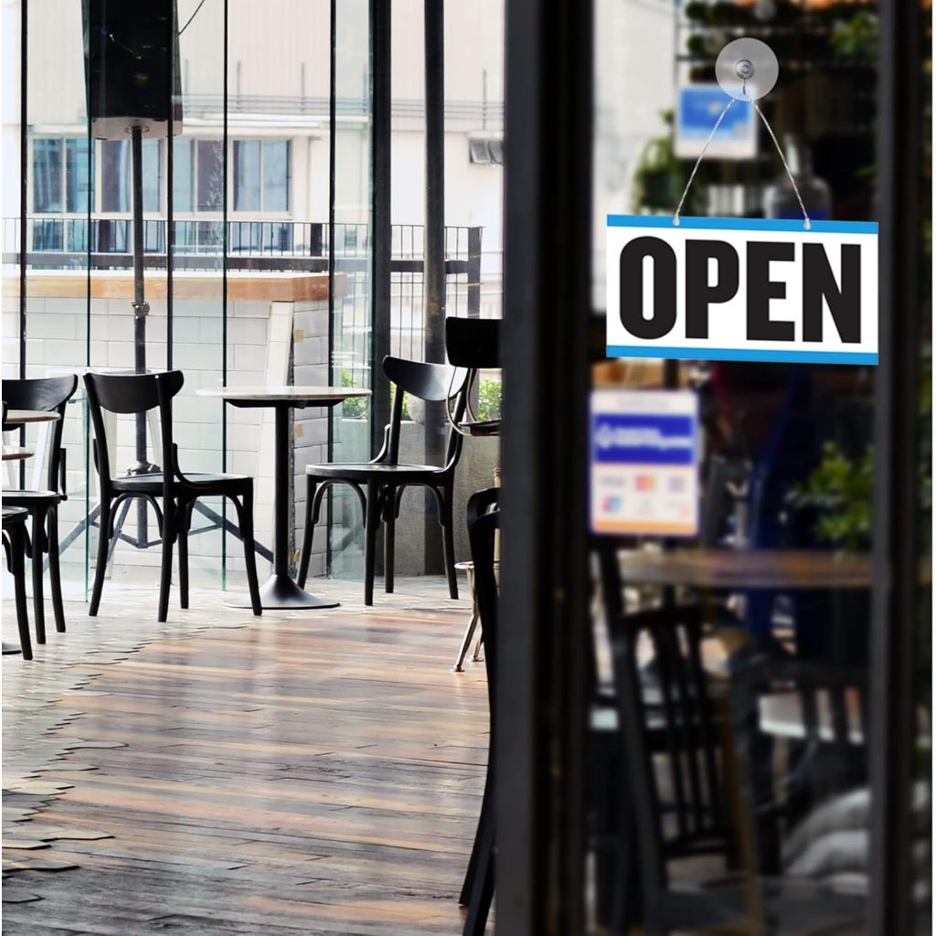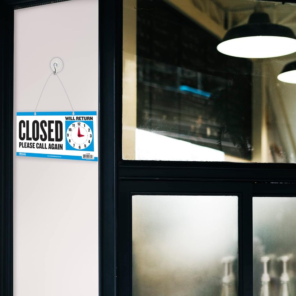 ● CLOSED & OPEN SIGNAGE. Blue and white background, black text, with red clock's arm. The high contrast lettering ensures high visibility from a distance. Ideal for retail, store, office, school.