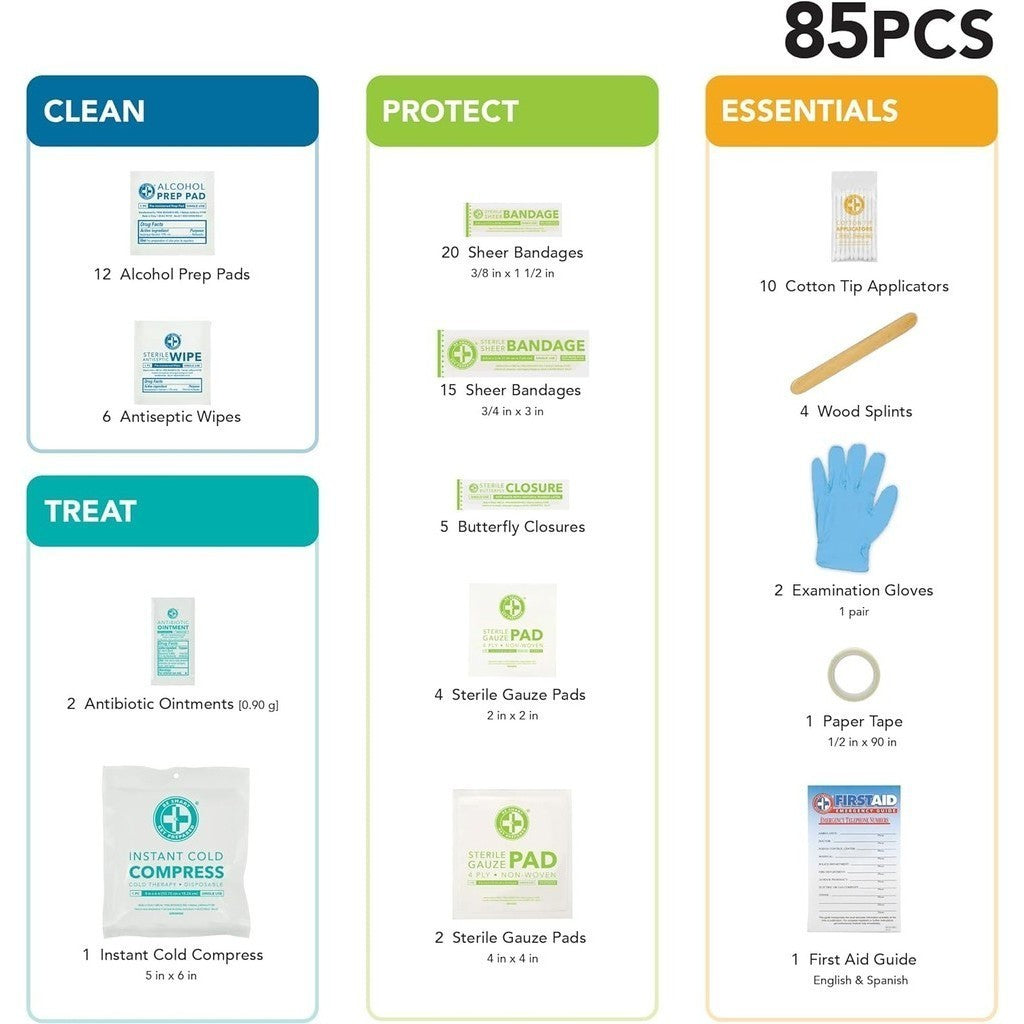 * Manufactured by the #1 leading manufacturer of First Aid Kits in the USA. 85 pieces of comprehensive, medical grade first aid treatment products.
