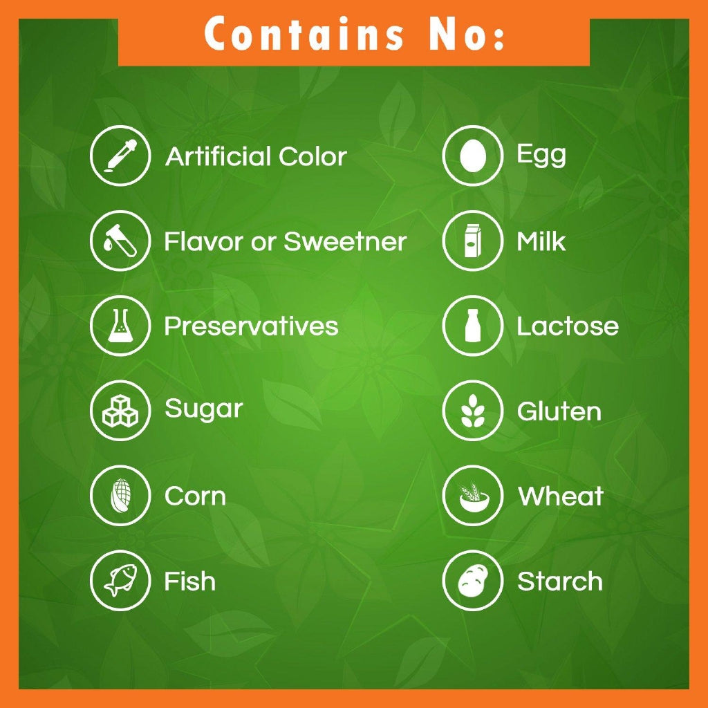 No Artificial Color, Flavor or Sweetener, No Preservatives, No Sugar, No Starch, No Corn, No Soy, No Egg, No Lactose, No Gluten, No Wheat, No Yeast, No Fish, No Sodium.