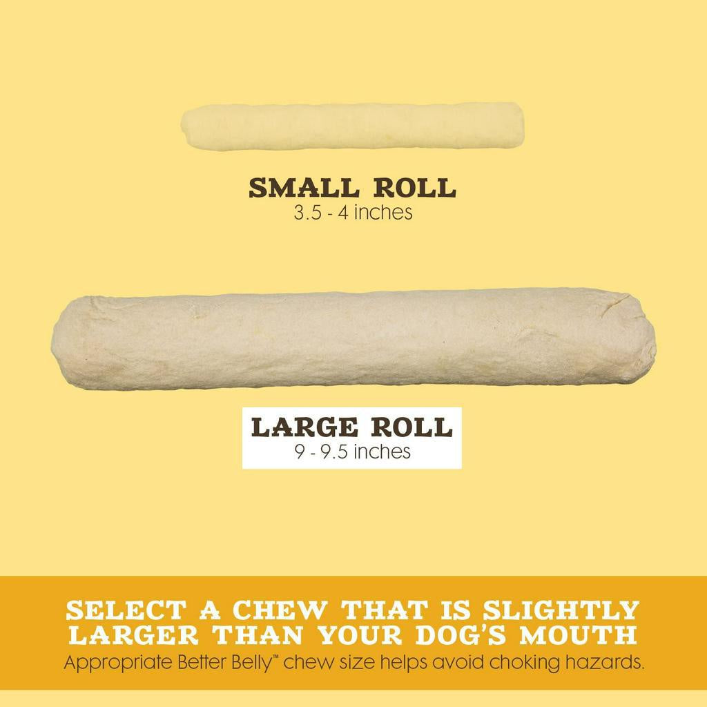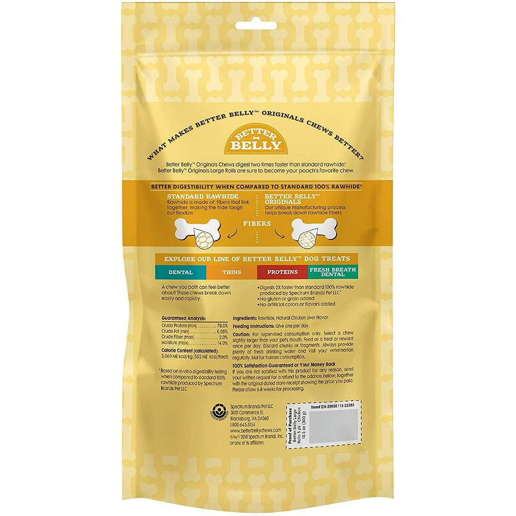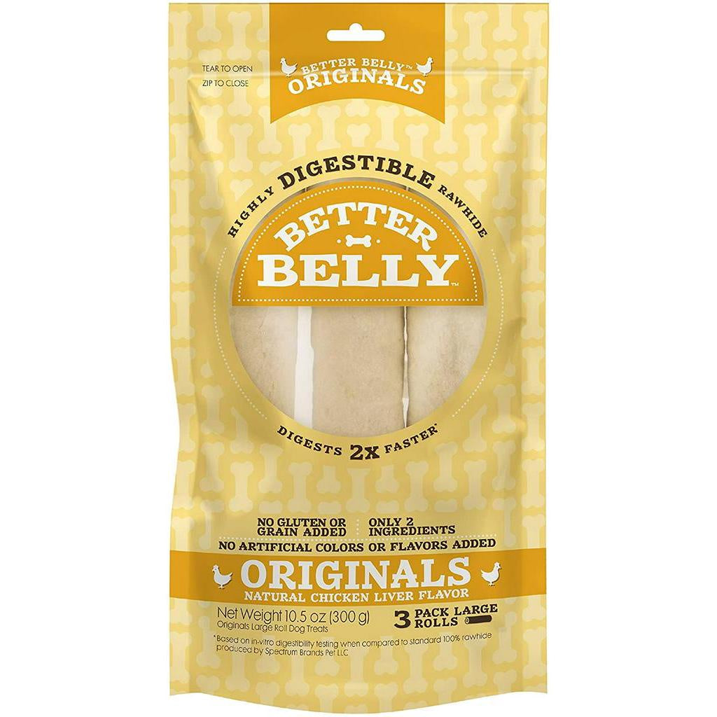 Better Belly Originals Chews digest two times faster rawhide. Better Belly Originals Small Rolls are sure to become your pooch’s favorite chew. Better Belly brand offers a variety of highly digestible chews for your dog. Our unique manufacturing process helps break down Rawhide fibers so your pup can digest them faster. With no gluten, grains, artificial colors or artificial flavors added, you can treat your dog to a chew you both feel good about.Better Belly Originals natural chicken liver flavor large rolls digest two times faster than standard Rawhide.* FREE of fillers, binders and artificial colors and flavors, These chews are sure to become your pooch’s favorite new treat. Standard Rawhide is made of fibers that link together, making the hide tough but flexible. Our unique manufacturing process breaks down Rawhide fibers for highly digestible Rawhide. Better Belly Originals natural chicken liver flavor large rolls provide pups with chicken liver flavor they love while satisfying their natural instinct to chew.