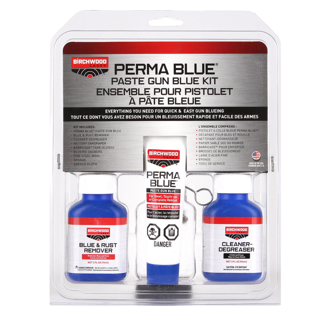 Easy to use, all-inclusive kits are the proven way to touch up or completely re-blue most guns. Everything you need for a professional-looking, first-class job is included. Choose from the fast-acting Liquid Gun Blue Kit and the deep, dense Paste Gun Blue Kit.Key Features:- The proven way for touching up or completely re-bluing most guns- The fast-acting liquid gives a non-streaky, uniform blue-black finish- Generous supply of everything you need to do a first-class jobPaste Kit includes:- 1-2 oz Perma Blue Paste Gun Blue- 1-3 oz Cleaner-Degreaser- 1-3 oz Blue & Rust Remover- 1 Bluing Applicators- 1 Sponge- 1 Service Cloth- 1 Barricade Rust Protection Gun Wipes- 1 Fine Steel Wool- Complete Instruction Guide