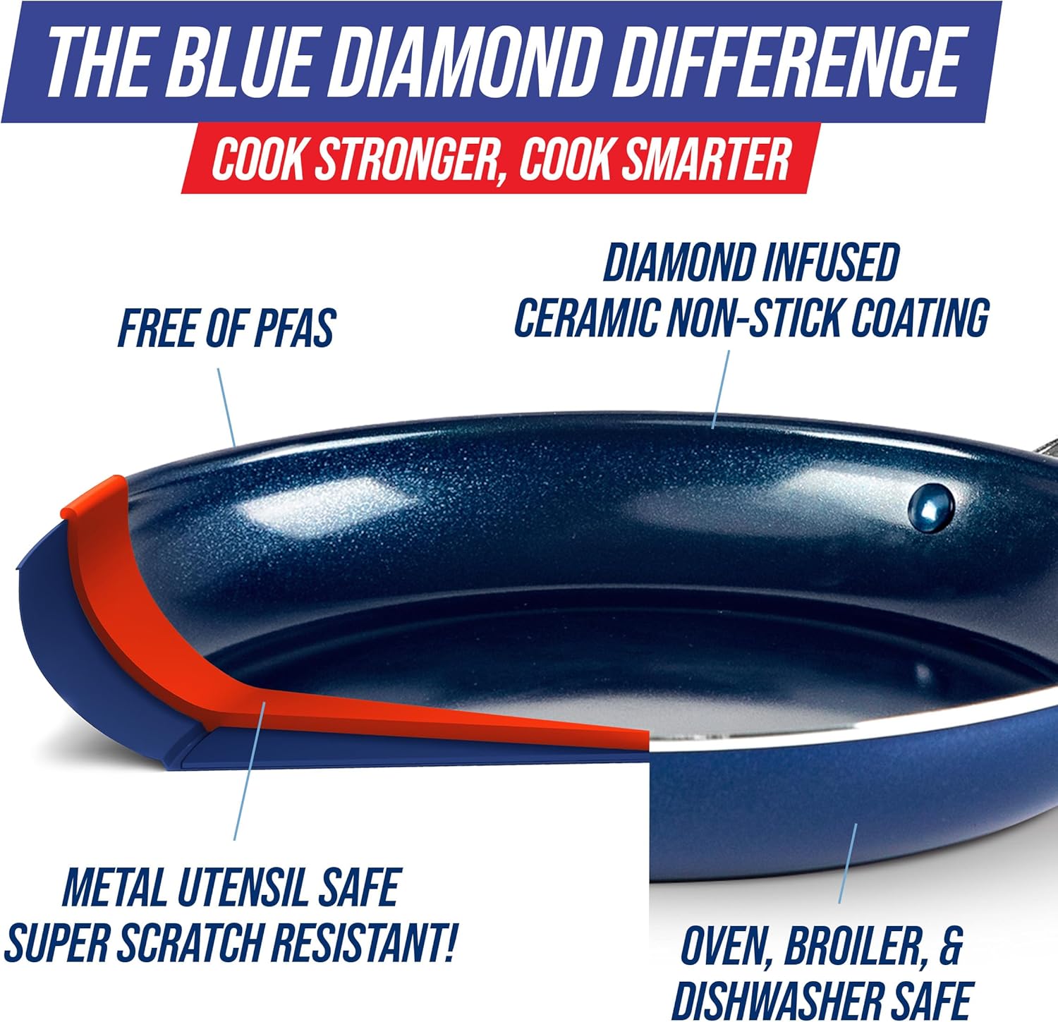 This cookware features a diamond-infused ceramic nonstick surface that’s 5x harder and lasts 10x longer than traditional coatings—tough enough for metal utensils. With diamonds conducting heat 4x better than copper, it ensures faster heating and easier cleanup. The toxin-free coating is free of PFAS, PFOA, lead, and cadmium for healthy cooking. A heavy-duty forged base prevents warping and wobbling. Oven and broiler safe up to 600°F and dishwasher safe for easy cleaning. The riveted stainless steel handle offers a secure, comfortable grip. Compatible with all stovetops except induction.