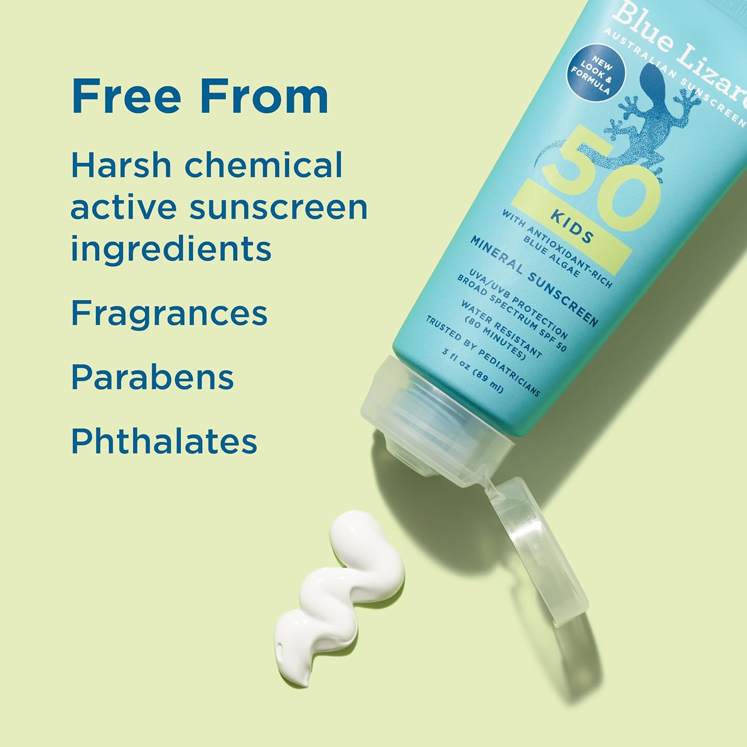 Blue Lizard Kids Mineral Sunscreen SPF 50+ (3 oz) offers broad-spectrum protection against harmful UV rays with a mineral-based formula. It contains Zinc Oxide and Titanium Dioxide for effective sun defense. Free from oxybenzone and octinoxate, it’s reef-safe and gentle on sensitive skin. The sunscreen is fragrance-free, paraben-free, and water-resistant for up to 80 minutes. Its Smart Cap changes color in UV light as a reminder to reapply. Ideal for daily use, this dermatologist-recommended formula ensures your child’s skin is safe and protected.