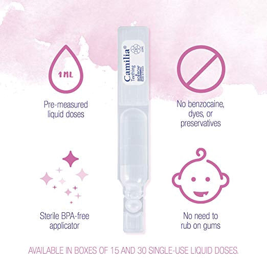 Camilia teething drops do not contain benzocaine, alcohol, flavors, dyes, lactose, sugar or artificial sweeteners. Available in a box of 15 and 30 doses, Camilia is recommended for babies one month and up and works best when taken at the first sign of teething.