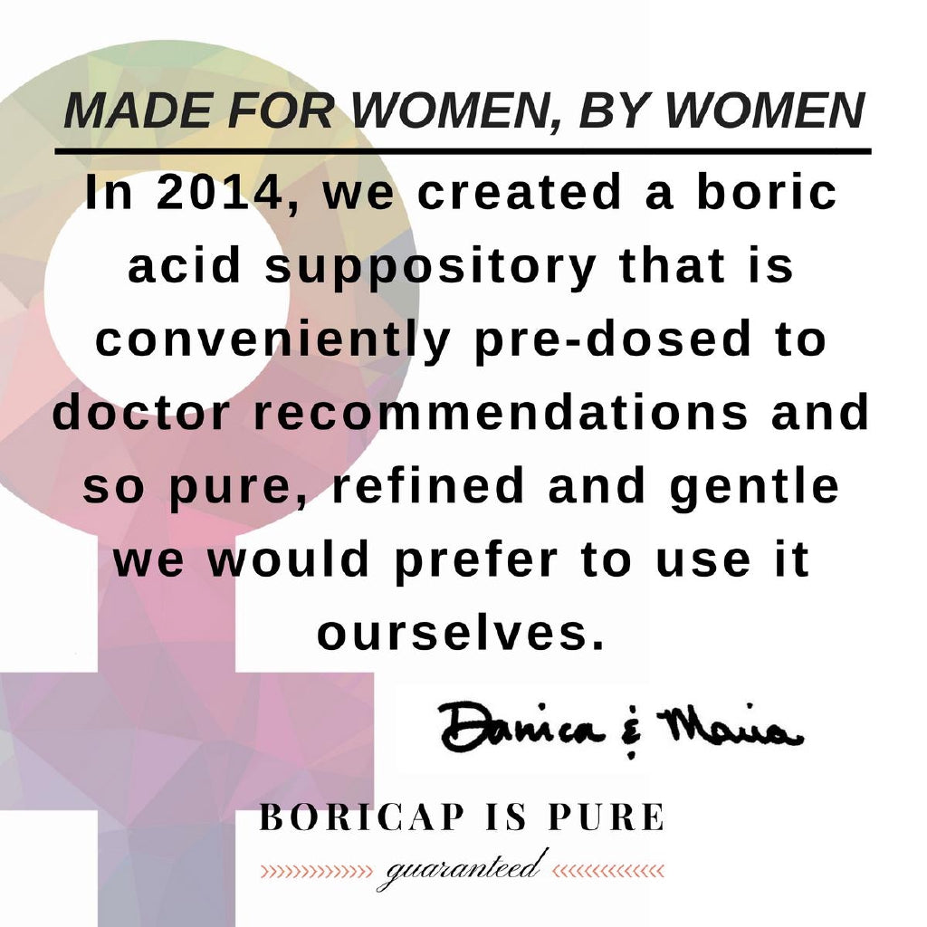 Created by women for women, BoriCap Boric Acid Suppositories 600mg helps women live better, healthier lives every day. Women who suffer from chronic or recurring yeast infections and bacterial vaginosis understand how frustrating and limiting facing these issues can be. With uncomfortable symptoms, frequent doctor visits and money wasted on ineffective remedies, a woman's confidence, relationships and quality of life suffers. Co-founders Maria and Danica have created a boric acid suppository so superior, effective and pure, they prefer to use it themselves! BoriCap is the gold standard for boric acid suppositories, and the reason it is stocked at pharmacies and doctors office across the US and Europe.