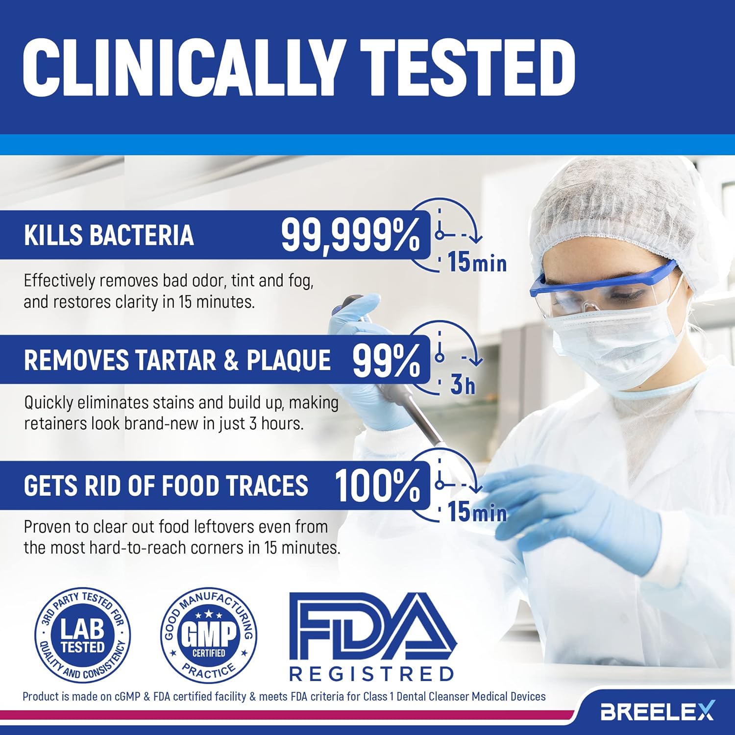 Breelex Denture Cleaning Tablets offer deep micro-cleansing for dentures, retainers, aligners, and night guards. Each tablet removes stains, plaque, and tartar while eliminating 99.9% of odor-causing bacteria. Easy to use—just dissolve in warm water, soak your appliance for 3–15 minutes, then rinse. The formula includes potassium peroxymonosulfate, sodium percarbonate, citric acid, and peppermint oil. Convenient and effective, it leaves appliances clean and fresh. Pack contains 6 tablets.