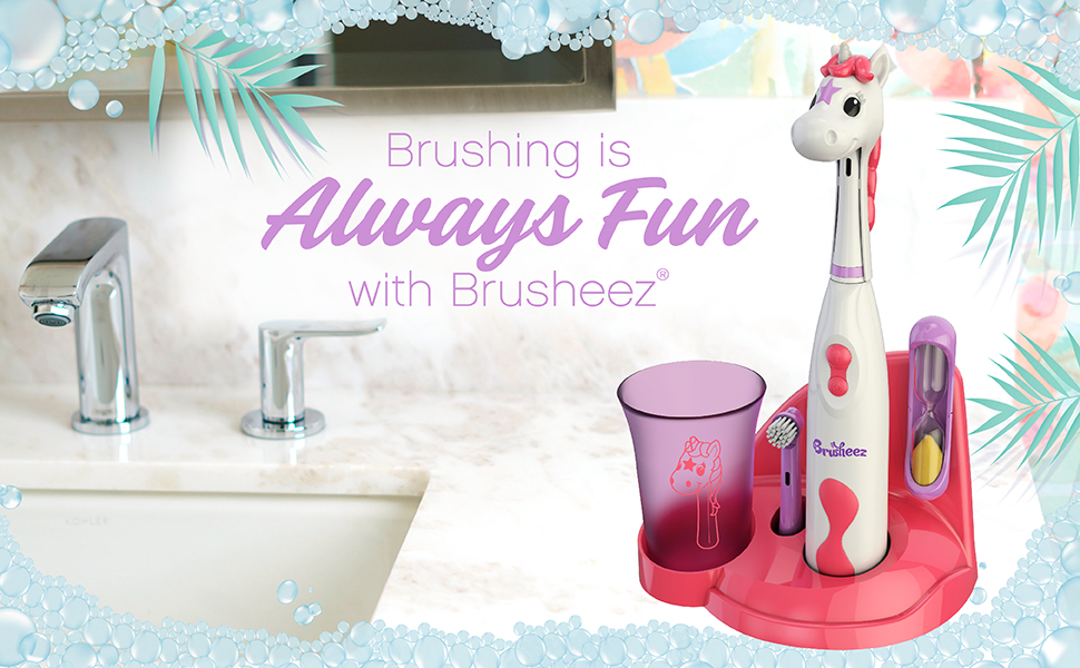 With an easy on/off button and a 2-minute sand timer, Brusheez pairs effective teeth cleaning with fun characters to help ease children into creating lifelong healthy habits. Soft bristles with gentle electric vibrations are safe on gums as they adjust to electric brushing and an extra brush head in a different color is included for replacement after the dentist-recommended 3 months. Incentives can go a long way in helping kids build good habits. The included brushing chart helps children remember to brush twice a day and gives parents a chance to positively reinforce good hygiene. The versatile stand holds the toothbrush, rinse cup, extra brush head, and sand timer while giving parents the option to mount Brusheez onto the bathroom wall or place it on the countertop.